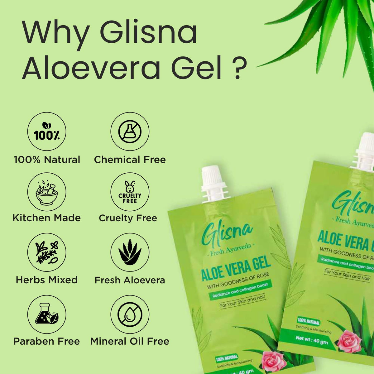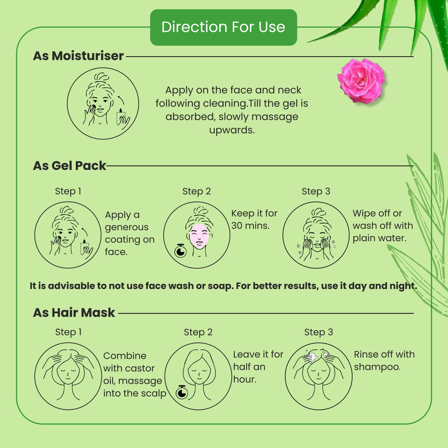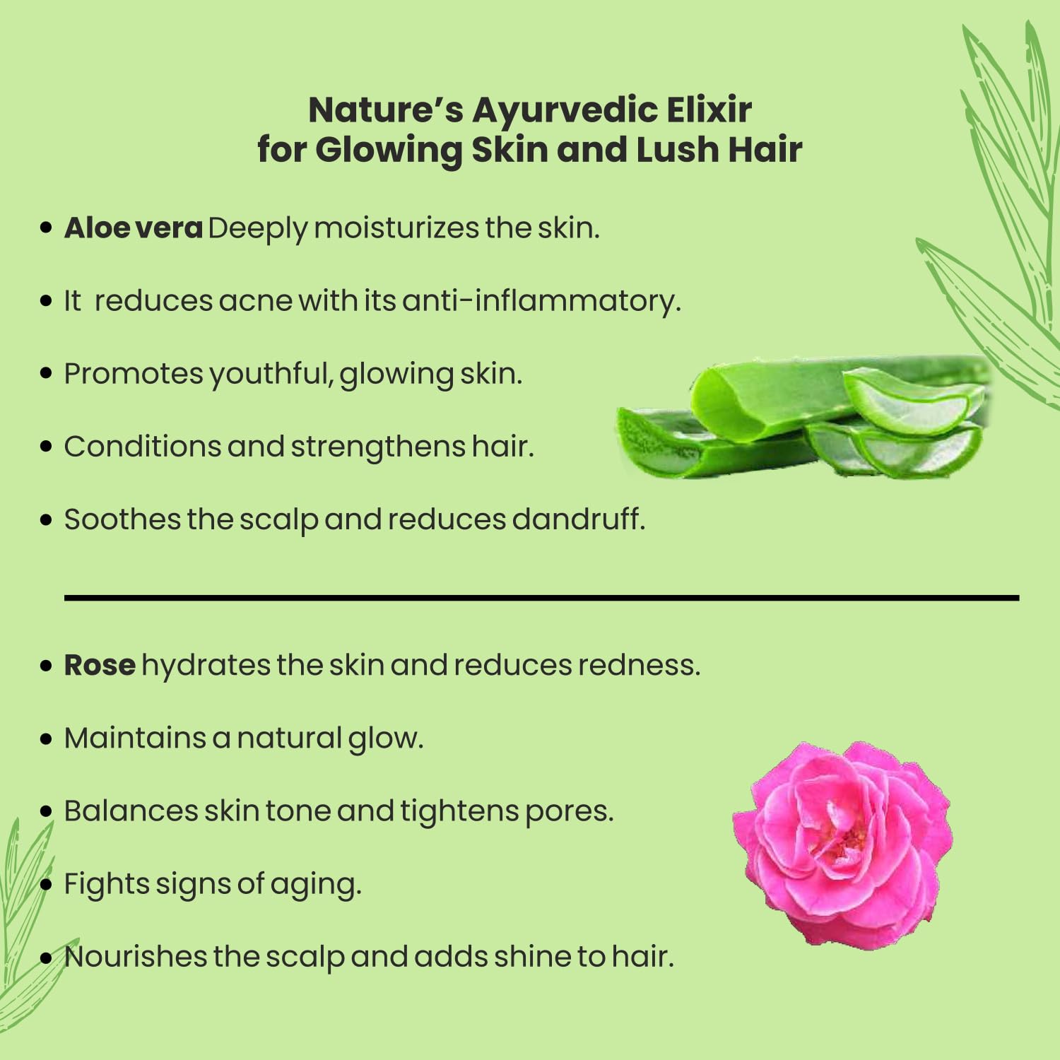 This Aloe Vera Gel is crafted with potent ingredients like aloe vera and rose. This blend boosts collagen production, evens complexion, and promotes radiant, supple skin. It also strengthens hair while calming the scalp for healthier growth.